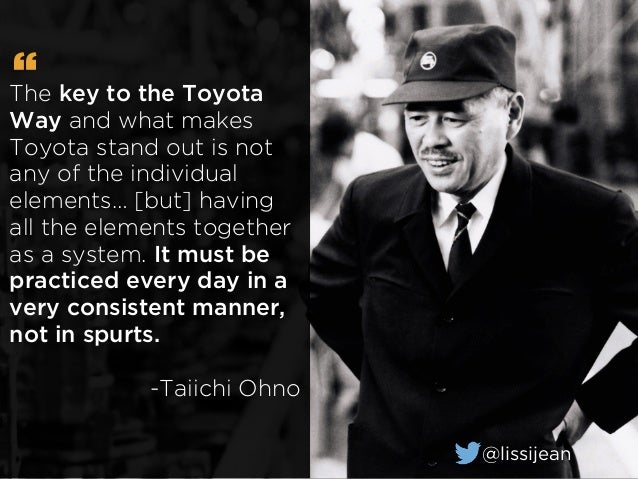 - 8. The key to the Toyota Way and what makes Toyota stand out is not any of the individual elements… [but] having all the elements together as a system. It must be practiced every day in a very consistent manner, not in spurts. -Taiichi Ohno “ @lissijean#AgileOTB