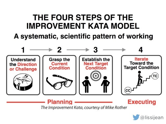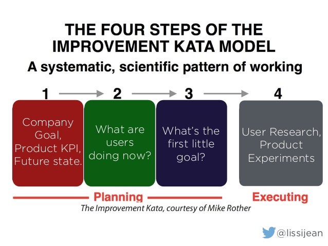 - 12. Company Goal, Product KPI, Future state. What are users doing now? What’s the first little goal? User Research, Product Experiments Product Kata 1 2 3 4 Planning Experimenting A scientific, systematic way to build better products. @lissijean#AgileOTB