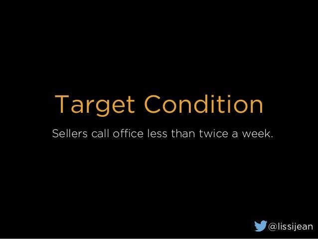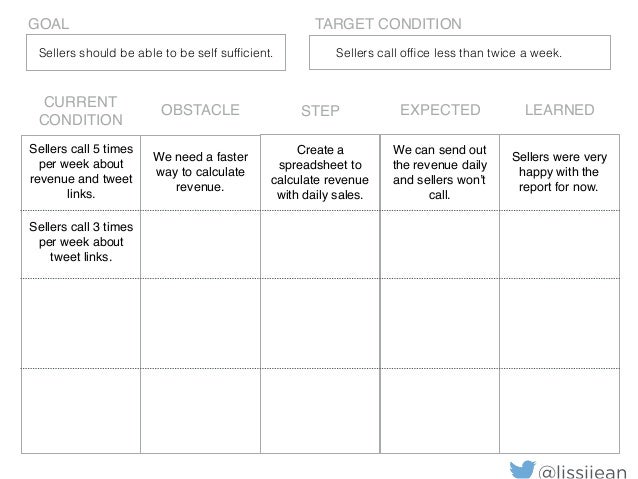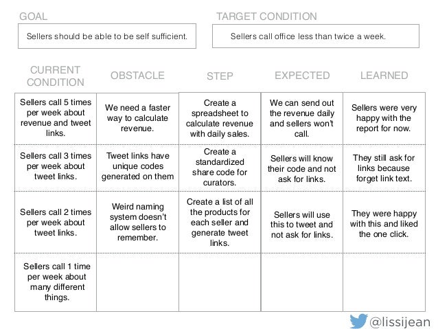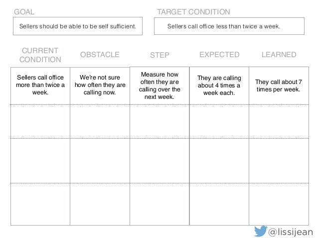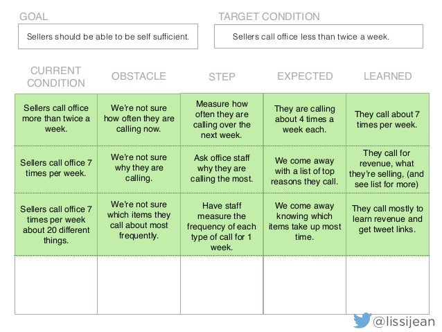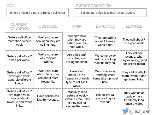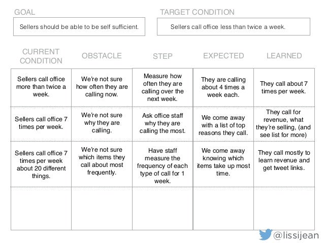 - 26. GOAL TARGET CONDITION CURRENT CONDITION OBSTACLE STEP EXPECTED LEARNED Sellers should be able to be self sufficient. Sellers call office less than twice a week. Sellers call office more than twice a week. We’re not sure how often they are calling now. Measure how often they are calling over the next week. They are calling about 4 times a week each. They call about 7 times per week. Sellers call office 7 times per week. We’re not sure why they are calling. Ask office staff why they are calling the most. We come away with a list of top reasons they call. They call for revenue, what they’re selling, (and see list for more) Sellers call office 7 times per week. We’re not sure which items they call about most frequently. Have staff measure the frequency of each type of call for 1 week. We come away knowing which items take up most time. They call mostly to learn revenue and get tweet links. Sellers call office 7 times per week. Have sellers call less for revenue. Provide sellers with a weekly revenue email. See if they call for revenue that week. The sellers will stop calling for revenue. They wanted an update more frequently than once a week. @lissijean#AgileOTB