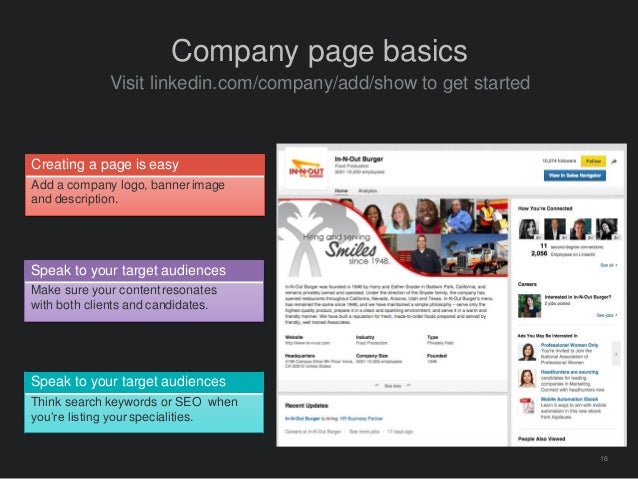 - 13. 16 Company page basics Visit linkedin.com/company/add/show to get started Creating a page is easy Add a company logo, bannerimage and description. Speak to your target audiences Make sure your contentresonates with both clients and candidates. Speak to your target audiences Think search keywords or SEO when you’re listing your specialities.