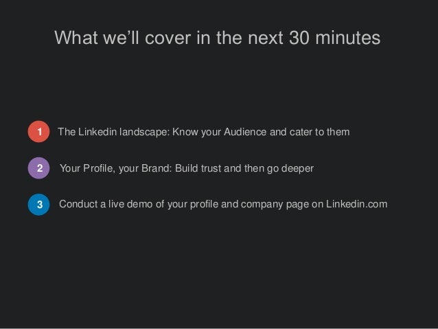 - 2. What we’ll cover in the next 30 minutes The Linkedin landscape: Know your Audience and cater to them Conduct a live demo of your profile and company page on Linkedin.com Your Profile, your Brand: Build trust and then go deeper 1 2 3