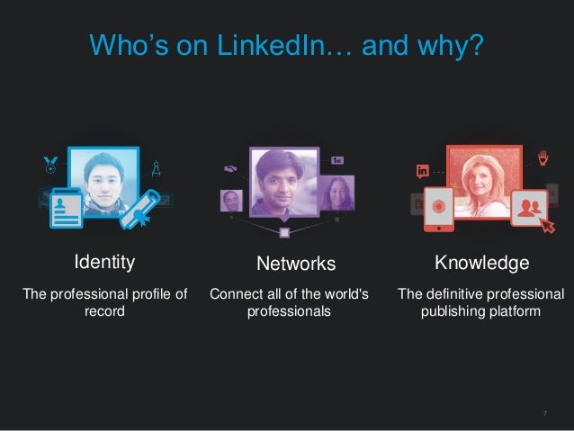 - 6. 7 The professional profile of record Connect all of the world's professionals Identity Networks Knowledge The definitive professional publishing platform Who’s on LinkedIn… and why?