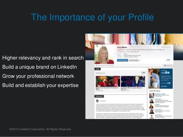- 8. The Importance of your Profile ©2015 LinkedIn Corporation. All Rights Reserved. Higher relevancy and rank in search Build a unique brand on LinkedIn Grow your professional network Build and establish your expertise